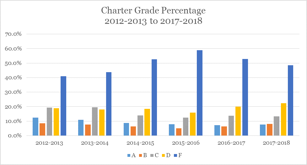Since the 2012-2013 school year, a total of 11,832 grades were handed out to the state's charter schools (only 7 schools were statewide e-schools for this whole period, by the way, so the vast majority of these grades are for brick-and-mortar schools). Of those 11,832 grades, more than half were Fs. That means since 2012-2013, charter schools have received more Fs than all other grades combined. The number of As? Barely 1,000. Out of nearly 12,000.