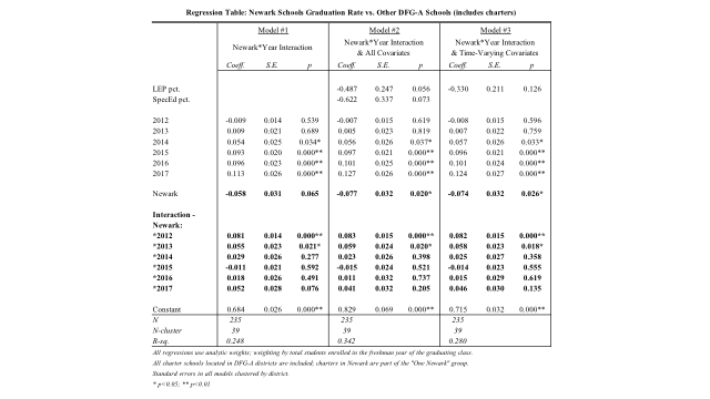 Again, it's clear that the statewide rise in graduation rates explains much of the growth in rates in Newark and Camden -- even when we add in charter schools. Yes, Newark does close the gap somewhat with other DFG-A districts. But I did some econometric modeling, and the change is not statistically significant. The updated regression outputs, using 2017 data, are below.