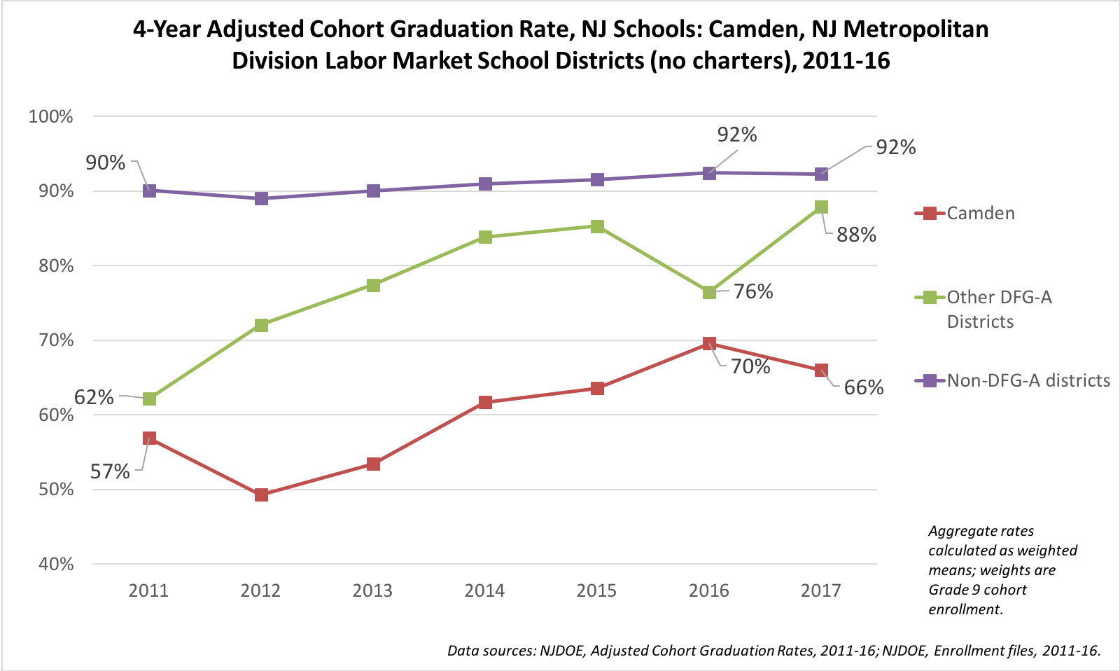 To determine which districts we should compare to Newark and Camden, I use the state's District Factor Groups (DFGs). Districts in the same DFG have similar socio-economic profiles; both Camden and Newark are DFG-A districts. The state began a new way of reporting graduation rates in 2011, so that's the baseline year. You can find all the rest of the technical information in the brief.