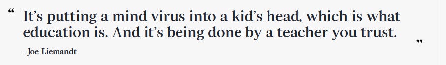 Price, Liemandt, Alpha, and Timeback– they’re saying the quiet part out loud: the goal is not to help children or improve education; their goal is to scale their business and their product. Timeback is the operating system above a “core generation engine” called “Incept”-- whose name Liemandt says is partially influenced by the Christopher Nolan movie “Inception”4-- and Liemandt’s interpretation of the meaning of “incept” reveals what he really thinks about education: “It’s putting a mind virus into a kid’s head, which is what education is. And it’s being done by a teacher you trust.”