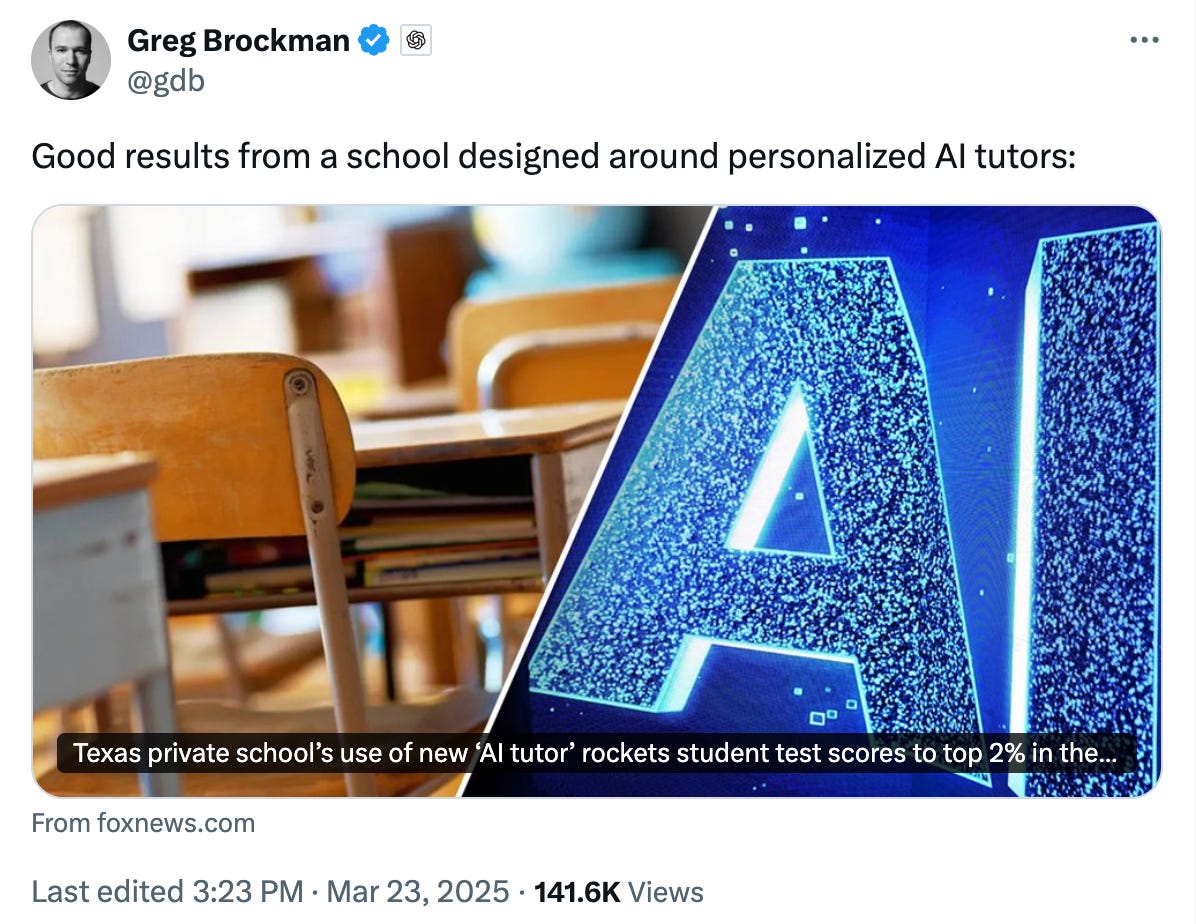 We’ll close with this: at the very end of this recent Today Show story on Alpha Schools, NBC reporter Nicky Nguyen comments, “The day we were [visiting Alpha School] there were multiple public school administrators on campus as well, receiving a tour and asking questions about how to best incorporate AI learning tools into a classroom environment.” It’s almost said as an afterthought, but we think it should be the main headline.