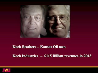 The action arm of the private corporations is known as ALEC – the American Legislative Exchange Council. ALEC is funded by right-wing foundations and private companies – the Walton family, the Koch brothers, K12 Inc. ALEC takes state legislators on fancy golf holidays to the Caribbean and hands them drafts of bills that they want introduced back home: charter school bills, assessment & testing bills, private prisons bills, bills about the sale of tobacco and alcohol. In 2012, 1,000 ALEC-written bills were introduced into state legislatures and 100 became law. Twenty-two current or former members of the AZ legislature are members of ALEC – all Republicans, including Governor Brewer. Jonathan Butcher of Phoenix’s own Goldwater Institute is co-chair of the ALEC Education Task Force – on which committee he is the only person with absolute veto power over any recommendation emanating from the committee. (Butcher was interviewed on last night’s [March 21] local news applauding the Arizona Supreme Court approval of vouchers, i.e., Empowerment Scholarships. If you think the long arm of the Koch brothers will never reach down into your life here in Phoenix, Arizona, then please think again. [On the evening of March 22, '14, a large group of Arizona Republican legislators was entertained at Donovan's steak hosted by ALEC and a group of lobbyists. Donovan's entrées easily top $50; not the kind of place that legislators hang out at when on their own dime.]