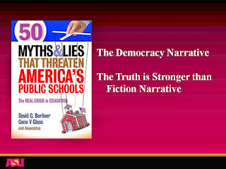 On Saturday, March 22, 2014, the edXchange initiative at the Mary Lou Fulton College of Education at Arizona State University held a public meeting at which the authors of 50 Myths & Lies that Threaten America’s Public Schools presented a preview of their new contribution to the debate on education reform. Something close to 150 citizens with an intense interest in the fate of our nation’s public school system were in attendance. Each of the 21 co-authors of 50 Myths & Lies spoke briefly about their contribution to the volume. A stimulating audience participation session followed the presentations. What follows are my remarks at the meeting. I spoke first and attempted to provide a bit of context for the group’s attempt to dispel the 50 myths and lies.