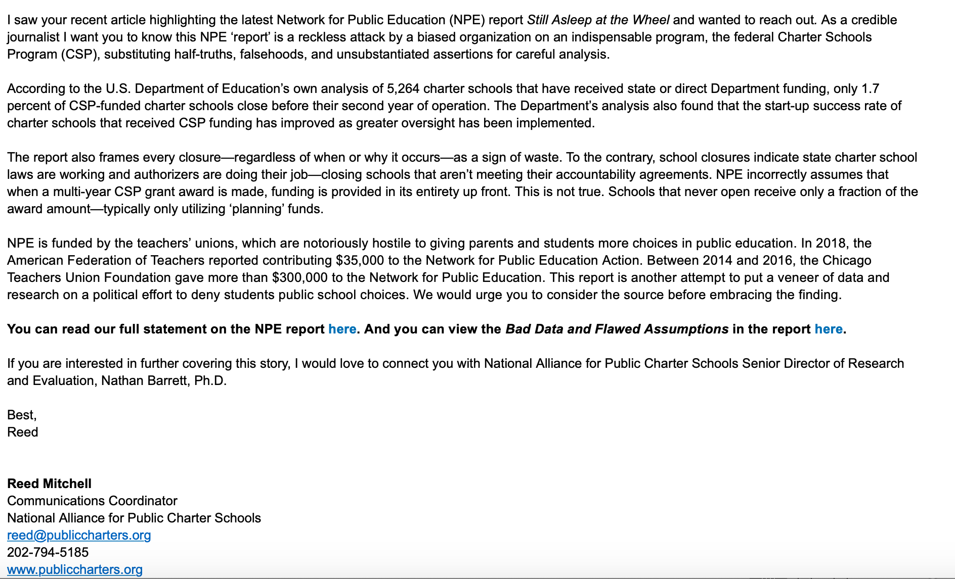 The second is a critique by the National Alliance for Public Charter Schools (NAPCS), which itself has received a grant of nearly $2.4 million from the Charter Schools Program. NAPCS, whose self-interest is obvious, slanders the report in emails sent to education reporters as “half-truths, falsehoods, and unsubstantiated assertions.”