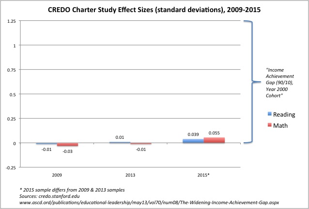 I made this chart a while ago, which compares the effects of charter schools, as measured by the vaunted CREDO studies, to the 90/10 income achievement gap: