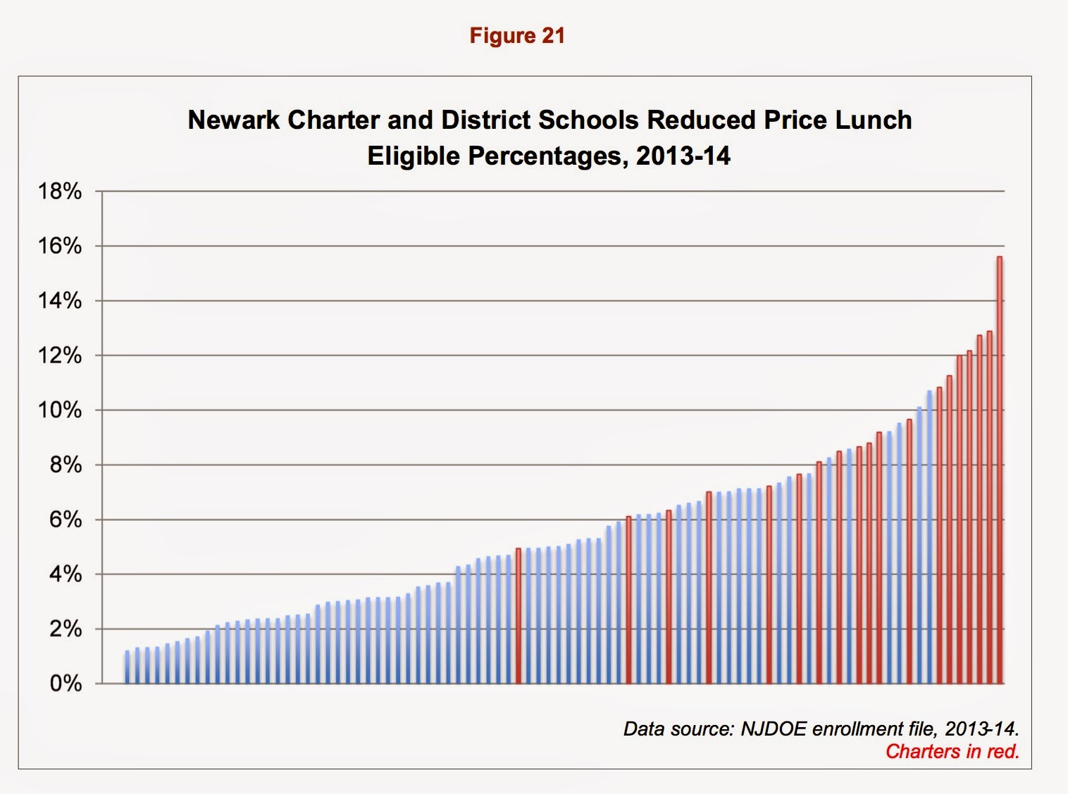 It's because Newark's charters serve relatively more students who are eligible for reduced-price lunch.