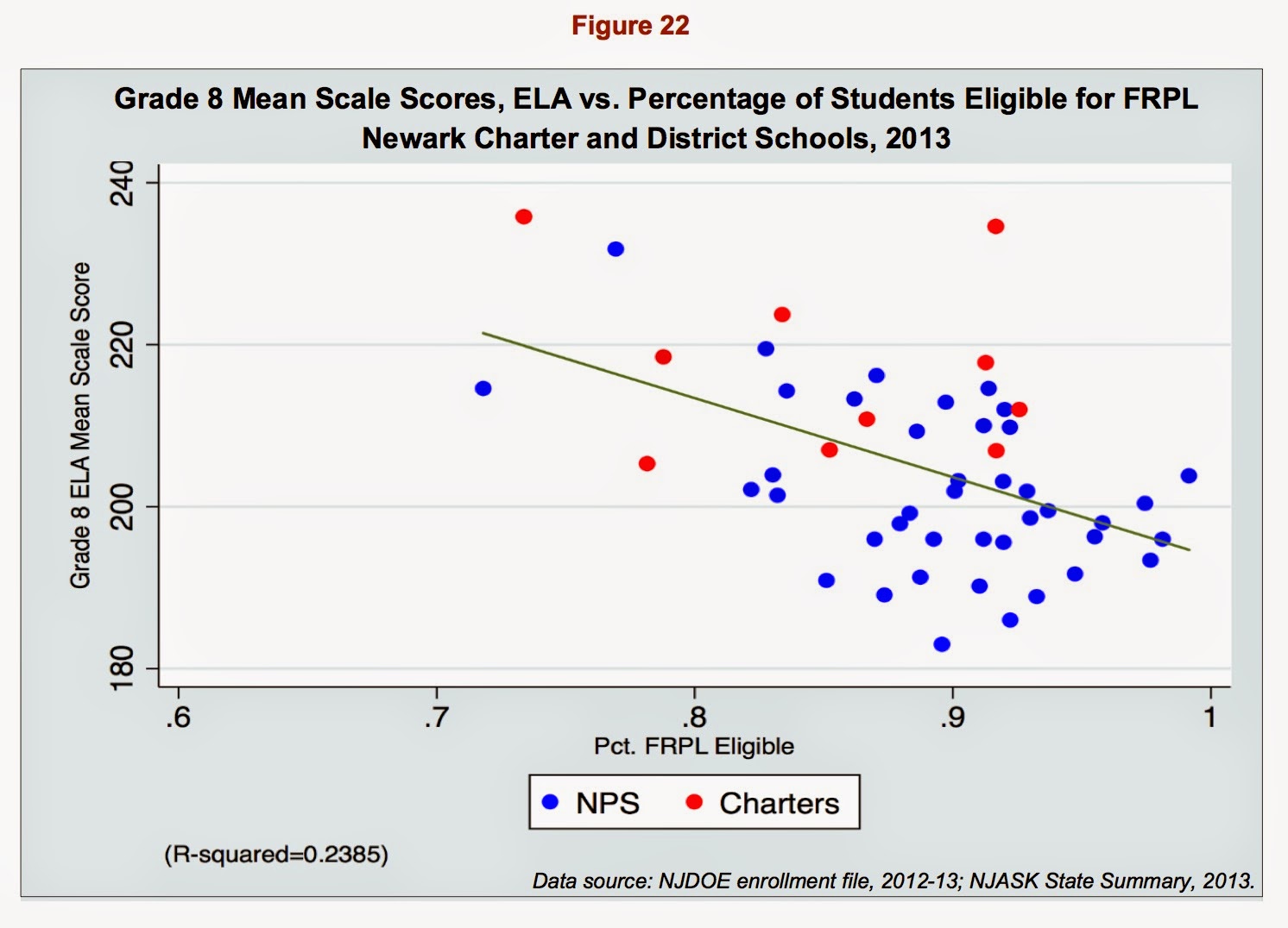 Now that we've established these facts, let's explore why they might matter. As everyone knows, student population characteristics affect test scores. When a school enrolls greater numbers of children who qualify for free or reduced-price lunch, they are very likely going to have lower test scores compared to a school that enrolls fewer of those children. Here's an example from Newark, using scores on the Grade 8 English Language Arts exam: