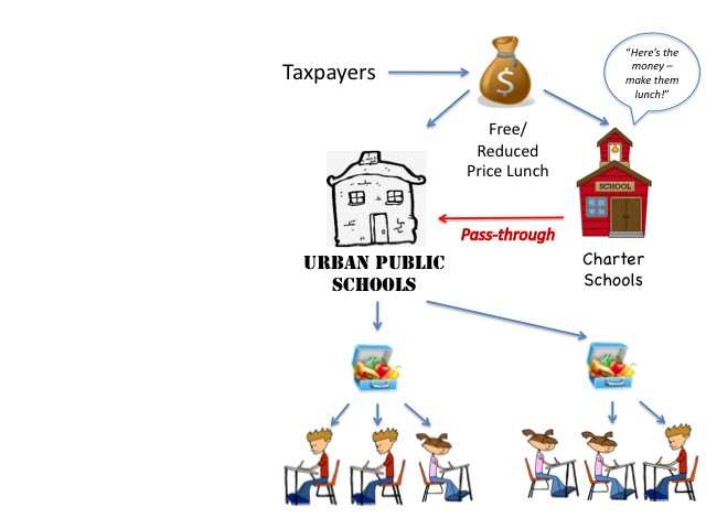 This time, the taxpayers are funding free and reduced-price lunches (FRPL). But let's suppose the charter school is contracting out its lunch service to its host district (from what I can tell, this seems to be a fairly standard practice, particularly in co-located charters). It passes through its federal lunch subsidy to the district, which, in turn, provides the charter students with their meals.
