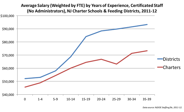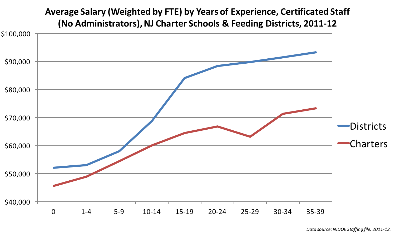 There are exceptions. As I've noted before, teachers affiliated with the largest NJ charter networks, such as TEAM-KIPP and Uncommon (North Star), pay teachers more at the outset of their careers. But the lack of experienced teachers on the staffs of these charter networks suggests they don't hang around long enough to make the high-five figure salaries* district teachers start to make around their second decade in the profession.
