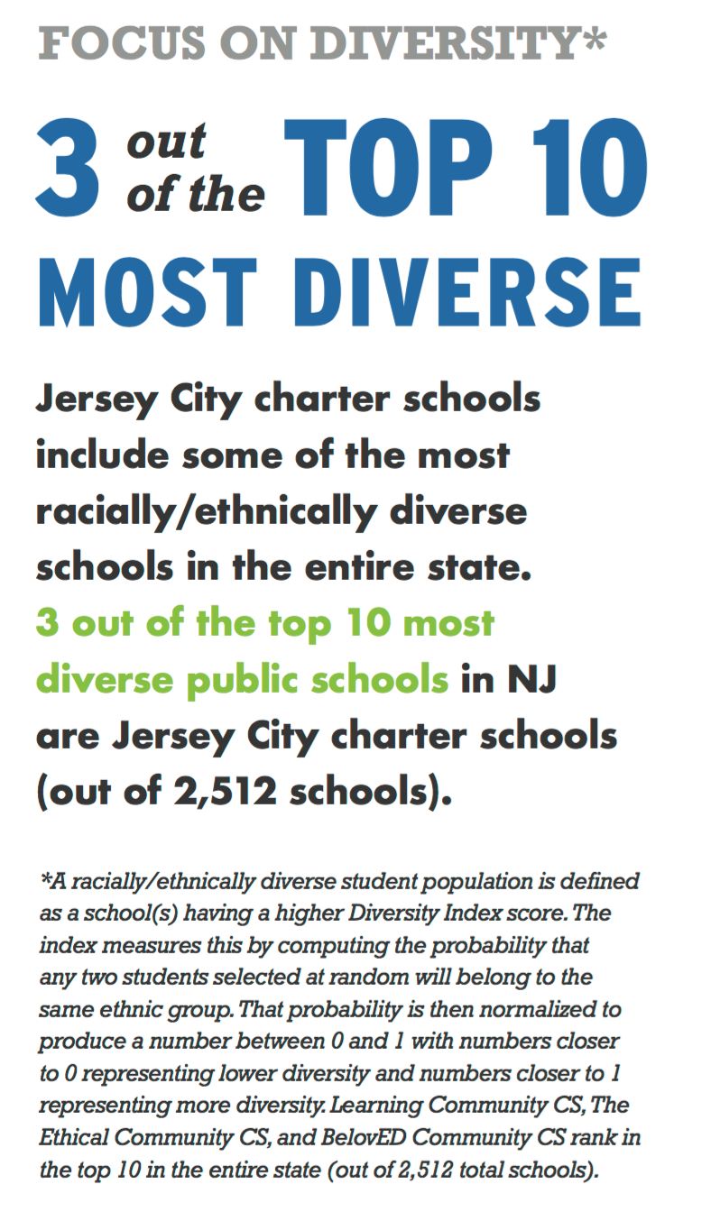 Three of the most “diverse” schools in New Jersey are charter schools when measured by the probability that any two students selected at random will belong to the same ethnic group (Learning Community Charter School, The Ethical Community Charter School and Beloved Community Charter School).In the 2017-2018 school year, about 49,100 children in New Jersey were charter school students. A true and correct copy of NJCSA fact sheets are attached hereto as Exhibit B. [emphasis mine]