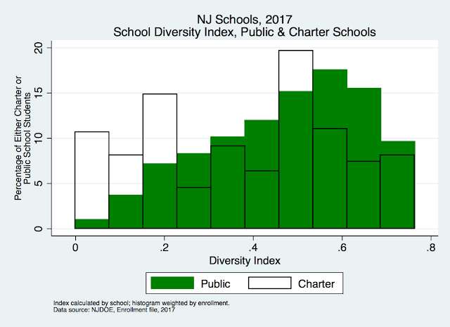 This takes a little explaining, so hang with me. The SDI in New Jersey varies from 0 (the least diverse school) to .76 (the most diverse school). I've divided all the students in New Jersey into 10 bins again; then I marked whether they were in charter or public schools. The green bars represent students in public district schools; the clear bars are the charter students.