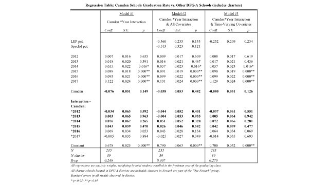 Again, it's clear that the statewide rise in graduation rates explains much of the growth in rates in Newark and Camden -- even when we add in charter schools. Yes, Newark does close the gap somewhat with other DFG-A districts. But I did some econometric modeling, and the change is not statistically significant. The updated regression outputs, using 2017 data, are below.