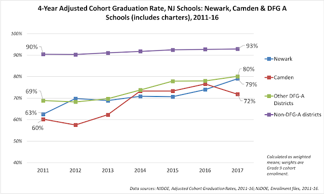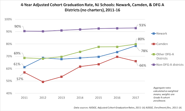 It makes no sense to judge Newark or Camden against districts that have graduation rates near 100 percent and therefore can't get any higher. What we should do instead is judge their graduation rate growth against similar districts -- which is what I've done in the brief, and now updated here with 2017 data.