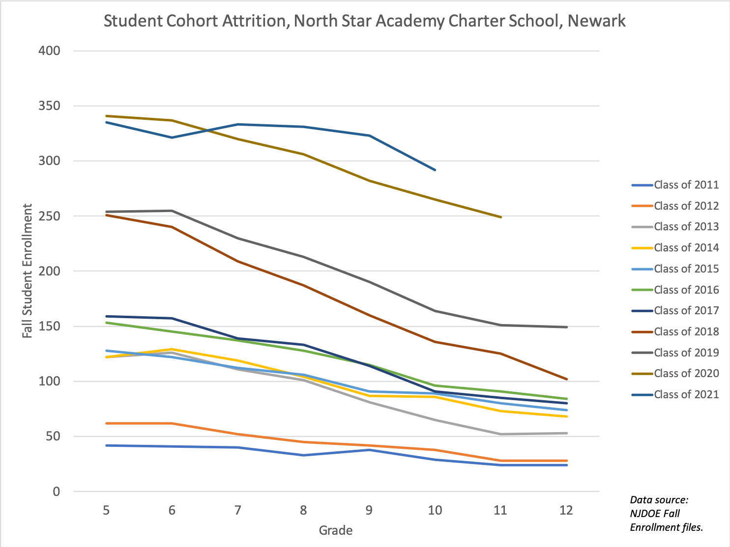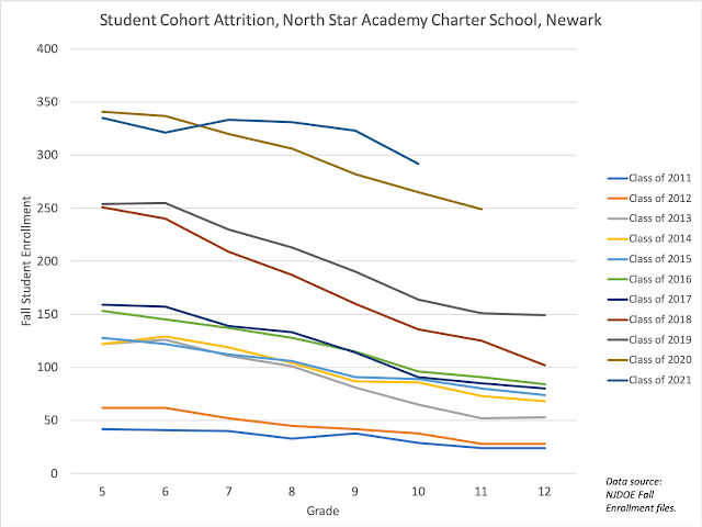 North Star Academy Charter School, the Newark branch of Uncommon Schools, sees its cohorts -- the students in the "Class of 'xx" -- shrink substantially between Grades 5 and 12. The Class of 2019 had 254 students in Grade 5; that was down to 149 in Grade 12.