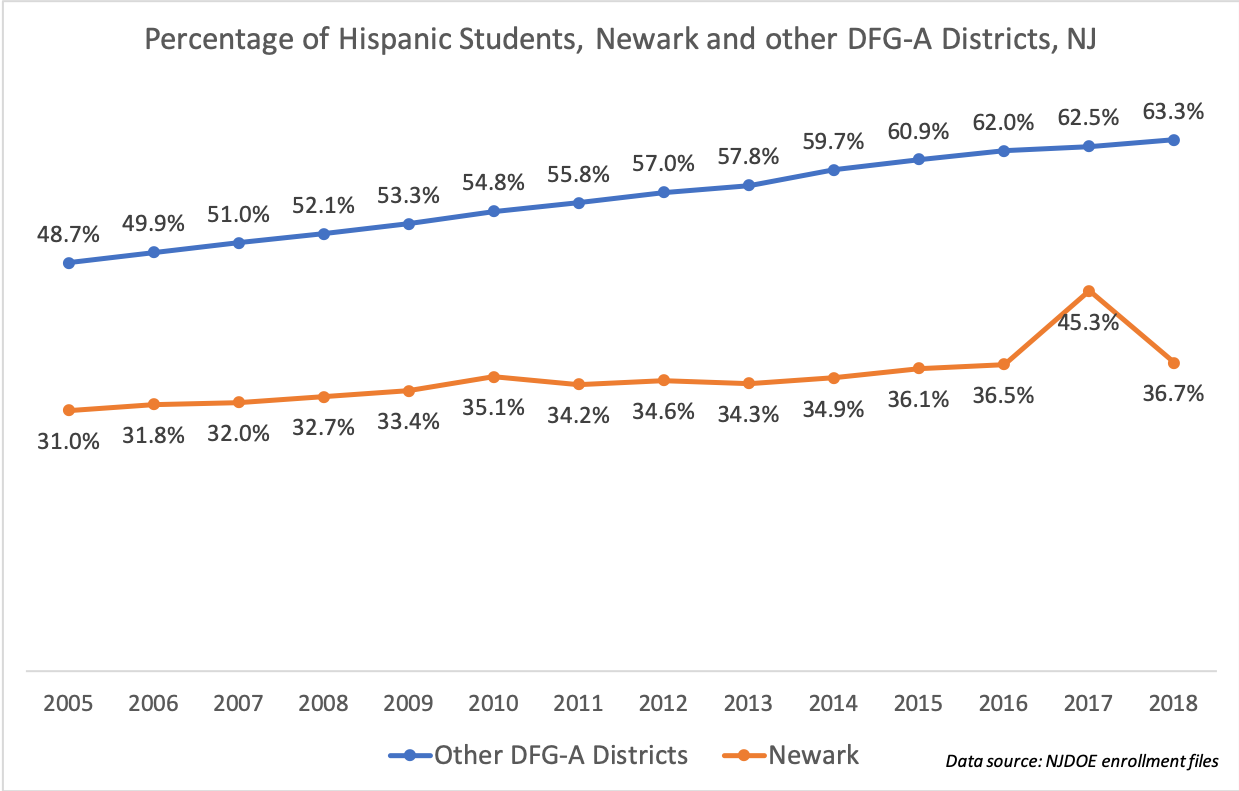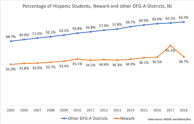 Newark's Hispanic student population has ticked up slightly (again, we've got some noise in the data). But the proportion of Hispanic students in the other DFG-A districts has risen substantially. And that means...