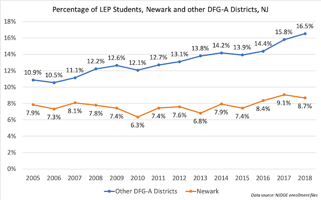 Newark's proportion of Limited English Proficient (LEP) students has stayed relatively constant, while the other DFG-A districts have seen big increases.