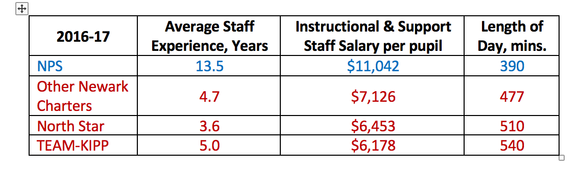 - Newark's charter schools employ strategies to gain resource advantages that can't be scaled up. I included this table in my last report in NJ charter schools: