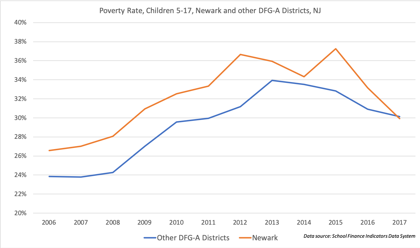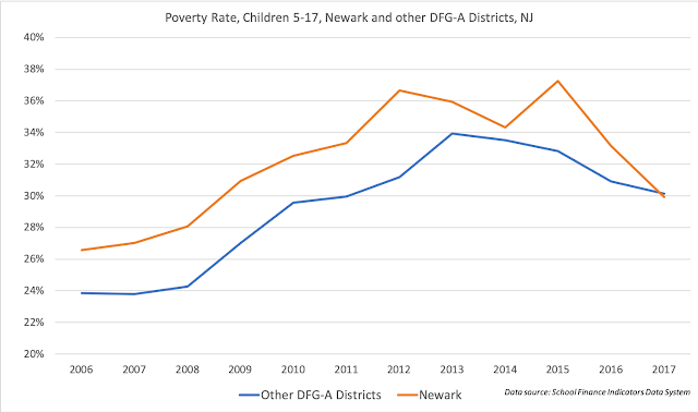 There's some noise here, but in general Newark's childhood poverty rate, which used to be high compared to other DFG-A districts, is now matching those districts. And there have been other demographic changes.