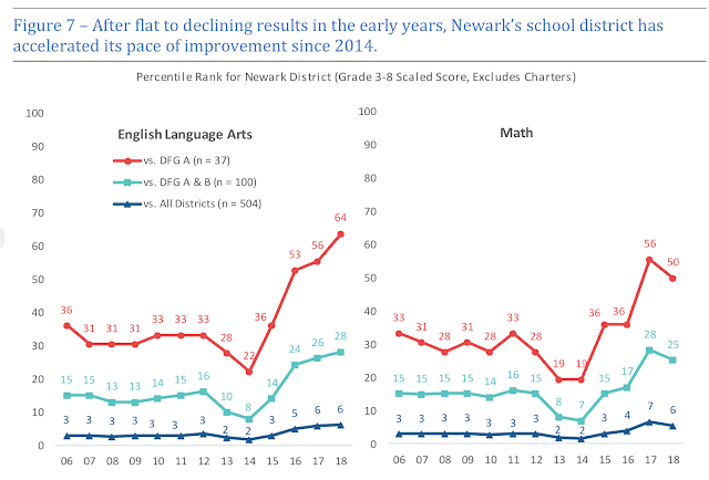 As Bruce and I noted in our 2017 report: the change from the NJASK to the PARCC in 2014-15 explains a lot of the "growth" in Newark's test outcomes. When you have a leap that large in one year, there's little reason to believe it's because your district suddenly and dramatically improved its instruction; more likely, the gains are due to Newark aligning its curriculum better to the PARCC than other districts. That's not necessarily because Newark's students are now better readers and mathematicians; they may simply be better test takers.