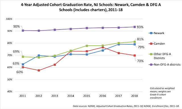 - There is nothing special about Newark's graduation rate increases. Back in 2016, I wrote a brief that tested the claim that Newark's (and Camden's) graduation rates were growing at an accelerated rate. The problem with the claim, I note, was that the city's graduation rate was being compared to the entire state's. But that comparison is invalid because many New Jersey high schools already have grad rates near 100 percent -- and you can't go higher than that!