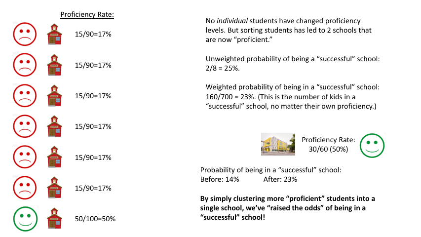 This is a great example of a talking point designed to sell an agenda, as opposed to illuminating an issue. It sounds great: more kids are in "better" schools! But the fact that the measure can be improved without changing any students' outcomes renders it useless.