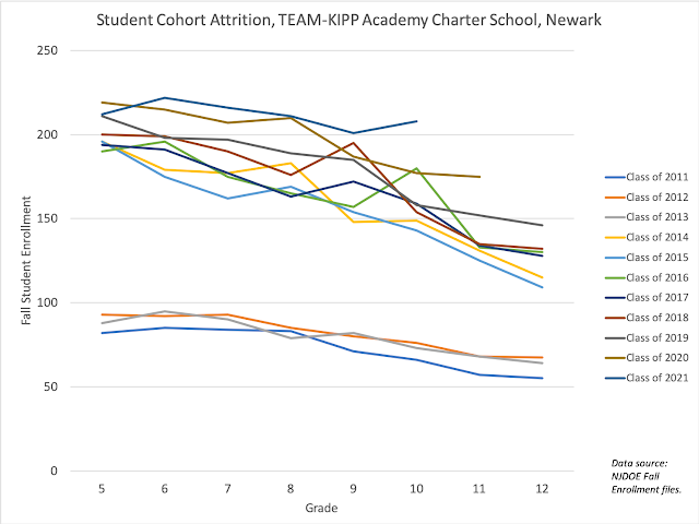 - Newark's high profile charters schools continue to have high rates of cohort attrition and/or student suspensions. Bruce Baker and I have made so many versions of this graph I've lost count: