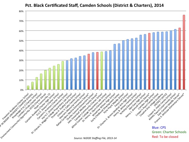 You'll notice the charters in Camden right now have small proportions of black staff members. There's every reason to believe this will also be the case at the three big CMOs' schools (I have more work coming out soon on this). Which means we are seeing a disturbing trend: black staff are being replaced by white staff in Camden, and for no apparent reason.