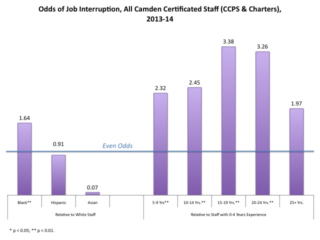 The double stars (**) indicate a high level of statistical significance, which means the odds I give here are very unlikely to be found randomly. Black teachers are 1.64 times more likely to suffer an employment consequence than white teachers. Teachers with between 15 and 24 years of experience are over three times more likely to suffer that consequence compared to teachers with 0 to 4 years of experience.