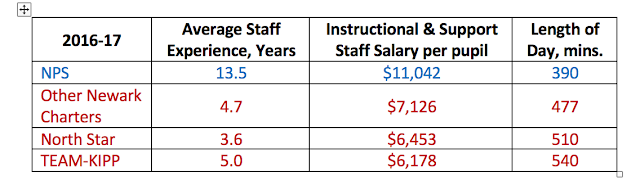 Newark's charter schools employ teachers who have far less experience than teachers in the public schools. Consequently, their costs for salaries are much lower. This allows them to pay their teachers more than comparably experienced teachers in the Newark Public Schools; for that extra pay, the charters offer a longer school day (and year).