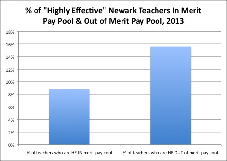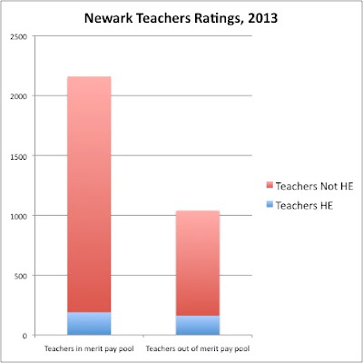 I blogged about that 2012 contract many times as it was being negotiated. It was never popular; only 37 percent of the membership approved it, thanks to low turnout in the voting. The teachers were promised up to $20 million in extra funding, over three years, dedicated to merit pay, all coming from Mark Zuckerberg's famous donation to Newark's schools. But the actual disbursement was far less: only $1.4 million in the first year. And much of that appears to have come from teachers who were denied regular annual raises due to "poor performance."