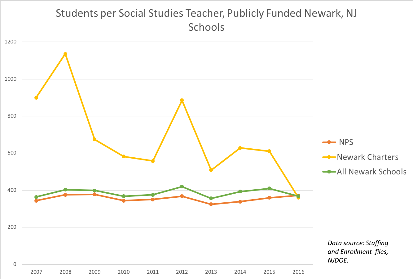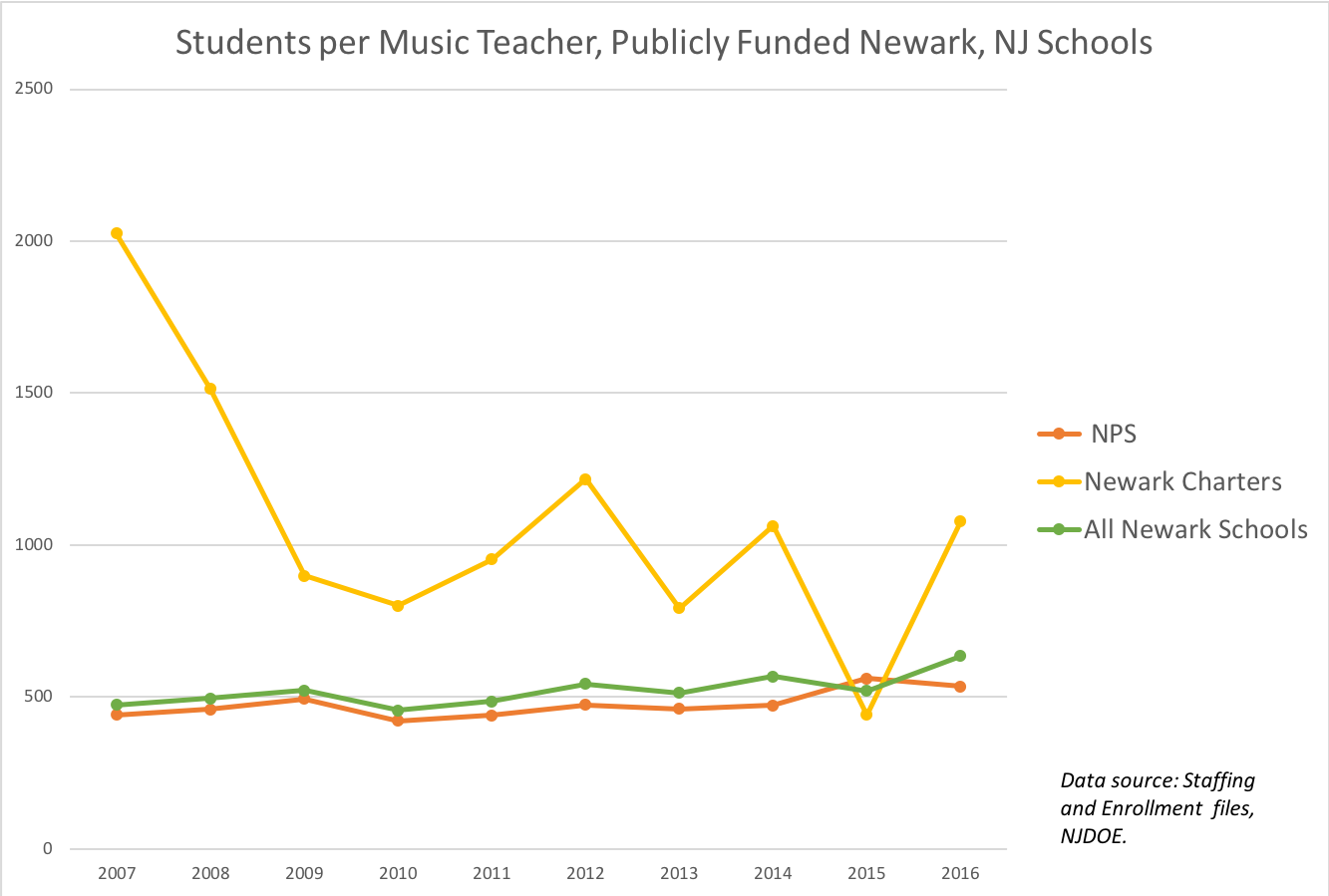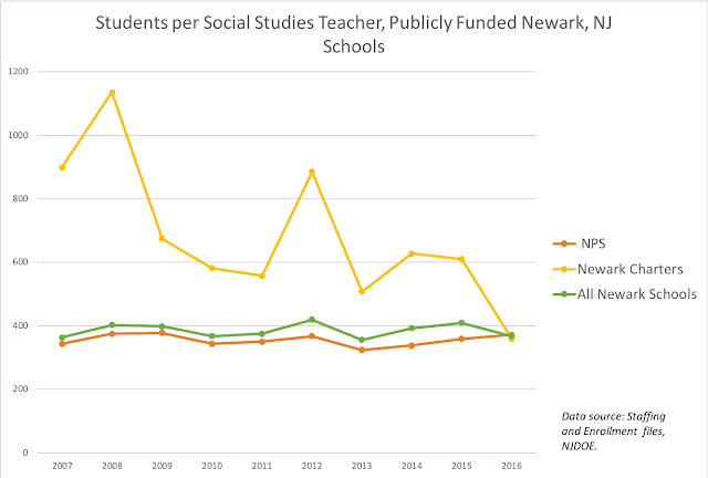 Again, there are some big swings. But the general pattern in Newark is that the charter schools historically have tended to deploy fewer teachers per pupil in non-tested subjects compared to NPS.