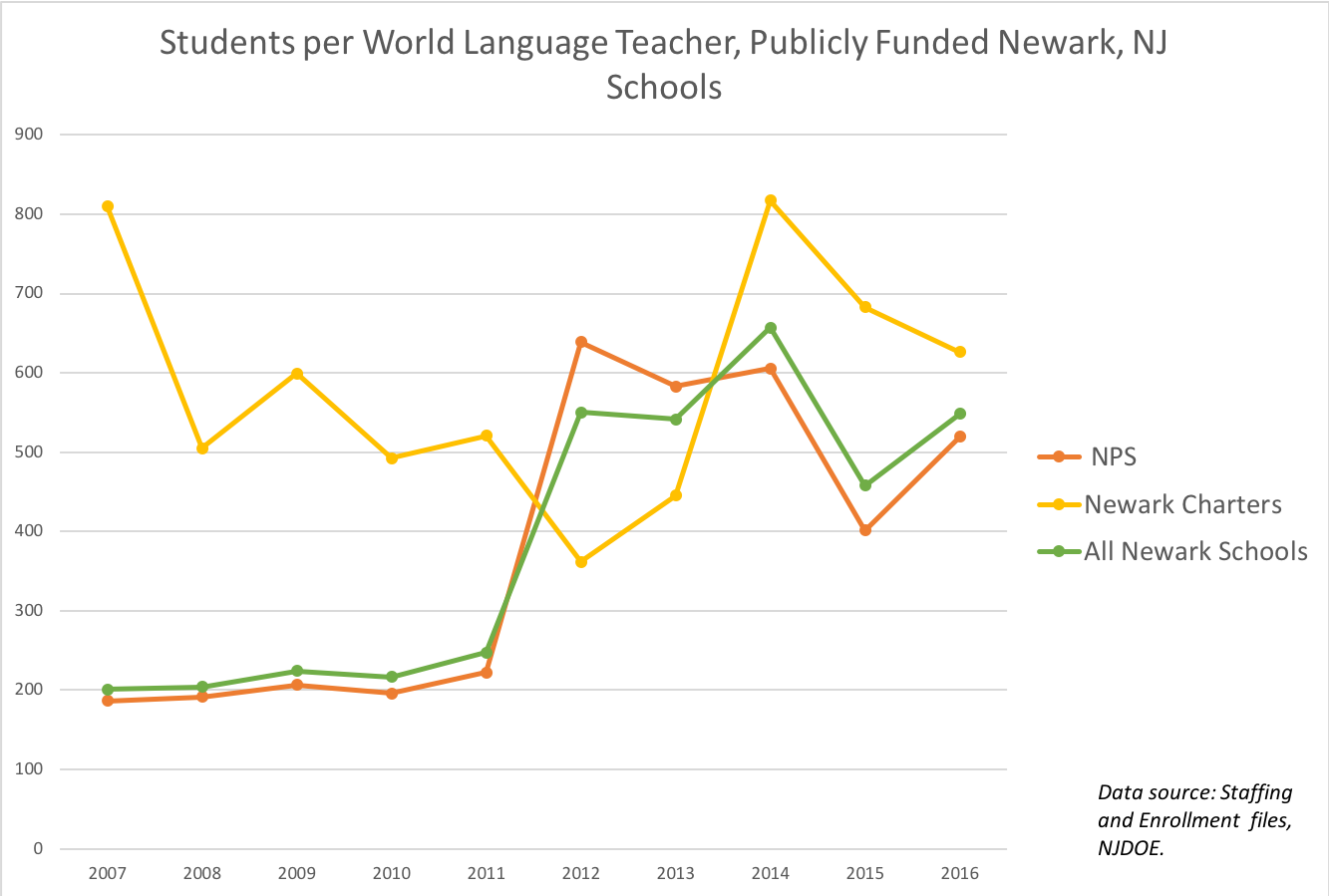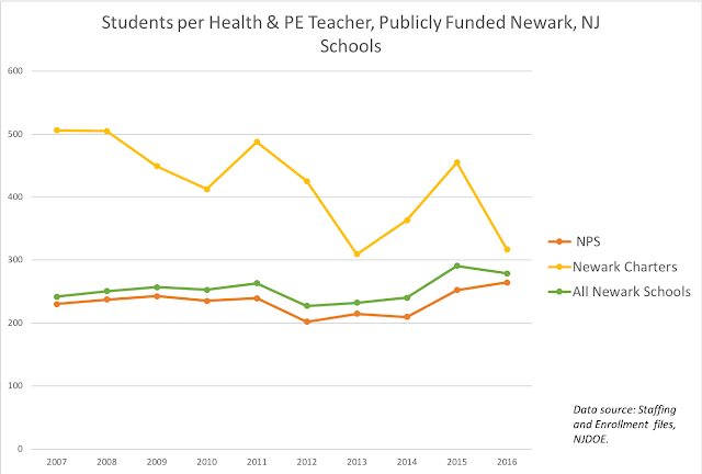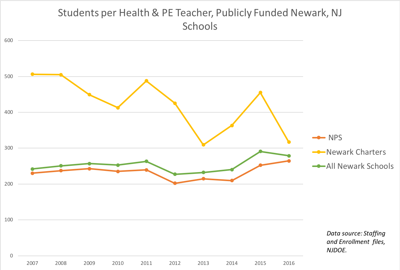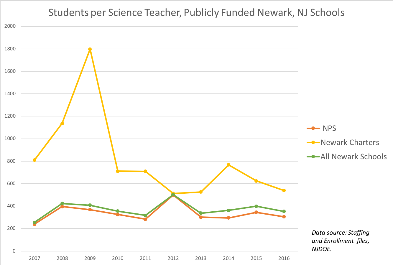 Again, there are some big swings. But the general pattern in Newark is that the charter schools historically have tended to deploy fewer teachers per pupil in non-tested subjects compared to NPS.