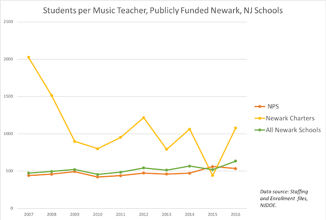 Year after year, Newark's charters provide their students with fewer art teachers per student, compared to NPS. There are some pretty wild swings in the data for the charters (NPS is quite steady). Historically, however, the charter sector just hasn't deployed as many personnel toward teaching art as the public, district schools.