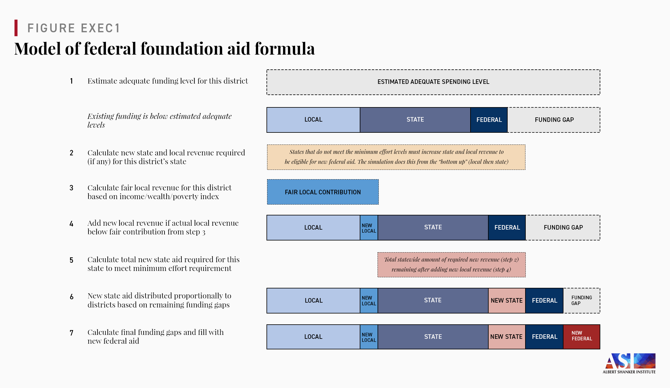This simulated proposal is a fundamental change to federal K-12 funding and would require major legislation. It is also an extremely ambitious proposal. According to our simulation, were it to be fully implemented with all states complying, it would bring all districts up to adequate spending levels, which we estimate would require federal K-12 aid roughly to double (the report is accompanied by an online data visualization tool with which users can simulate this proposal using different parameters).