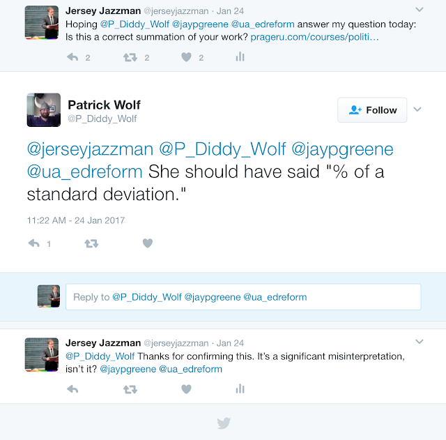 Using one of the many handy SD-percentile calculators on the web, that .27 is like moving from the 50th to the 61st percentile. The .15 is from the 50th to the 56th percentile. That's an improvement -- but to a layperson, I'm guessing it's a lot less impressive than Friedrichs' figures. Friedrich's video completely misstates the effect sizes of school vouchers, arguably in a way that makes them appear larger than they are.