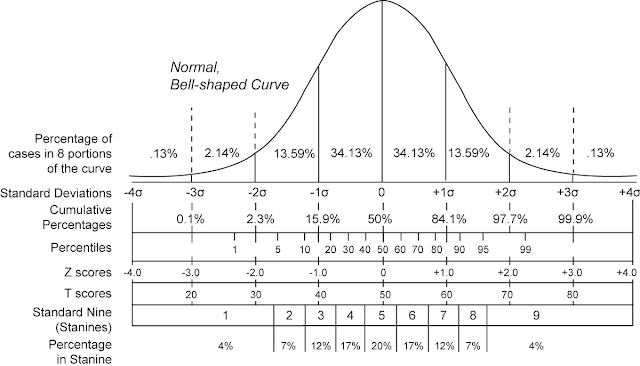 One way is to think about a normal, "bell curve" distribution of scores and how it would be divided up into percentiles: