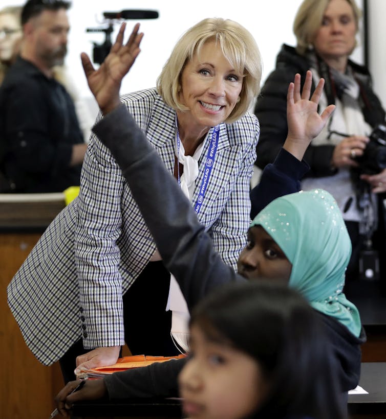 U.S. Education Secretary Betsy DeVos talks with students in Nashville, Tenn., in April, as lawmakers voted to expand school vouchers. Mark Humphrey/AP