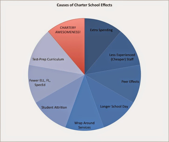 Here's a completely hypothetical pie chart from an earlier post. Let's imagine all the differences we might see between a charter school and a counterfactual public district school.