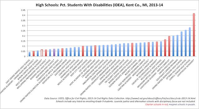 Dick DeVos's charter school enrolls relatively few Limited English Proficient students. Again, there may be good cause to set up a school like Newcomers Community (on the far right of the graph), which has a very high LEP percentage. But many of the other traditional public schools are taking at least some LEP students; WMAA is not.