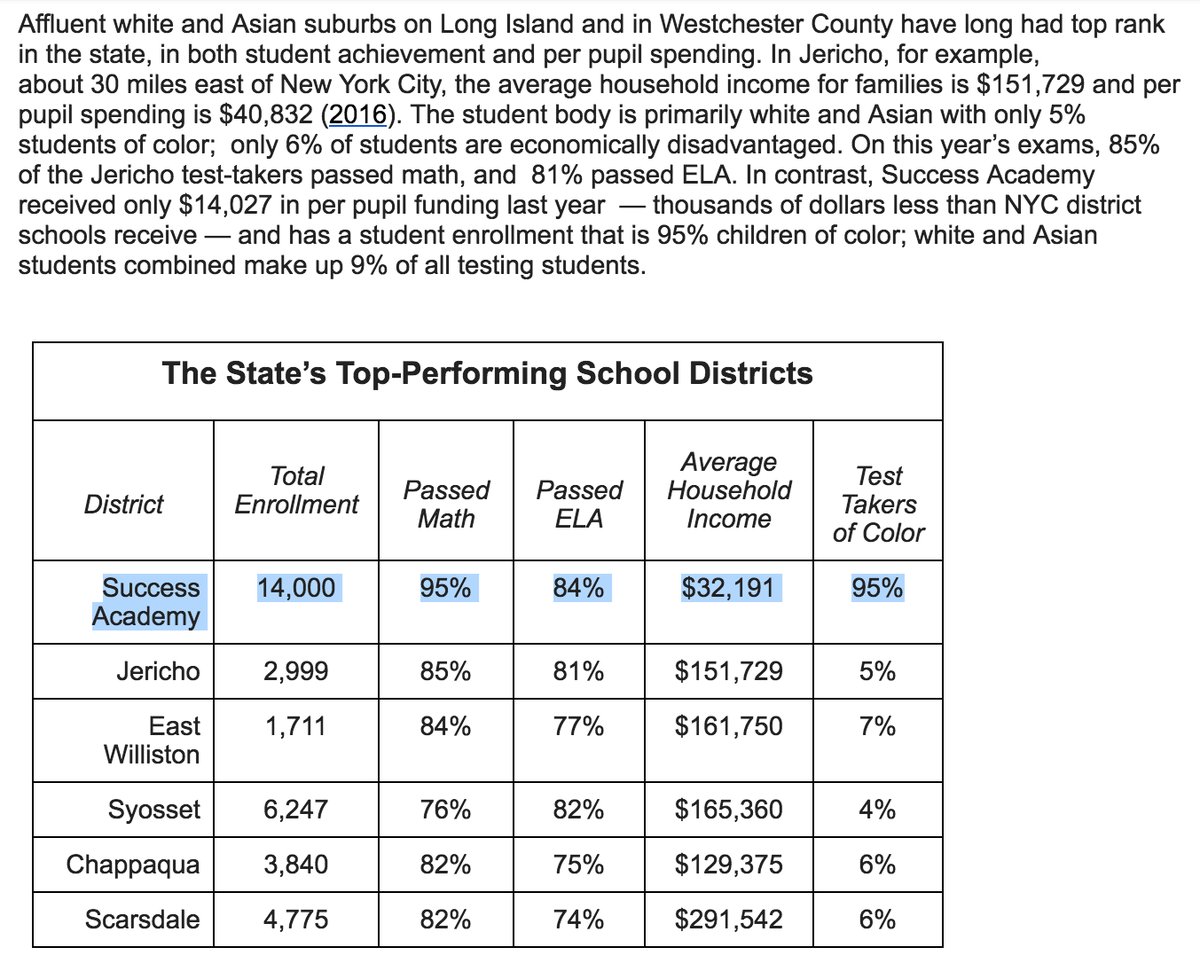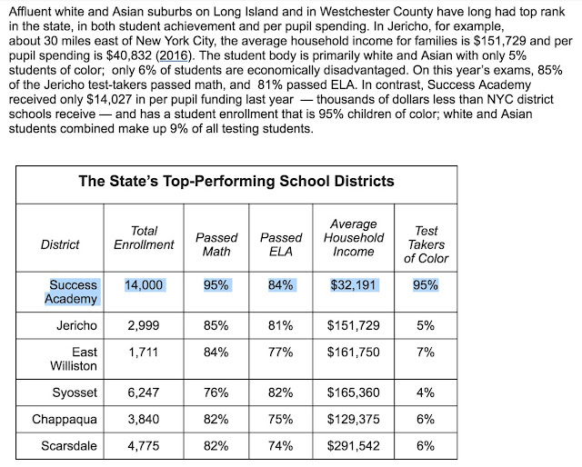 Next: when Moskowitz accuses the Times staff of the crime of growing up outside of the city, she extends a comparison that she has made repeatedly: Success Academy vs. suburban schools. Just yesterday, when the New York State test scores were released, SA sent out a press release that explicitly compared its students' results to students in public schools on Long Island and in Westchester County.