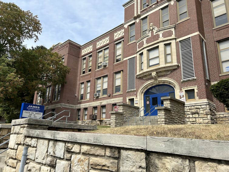 Built in 1910, James Elementary is a three-story brick school in Kansas City, Missouri’s historic Northeast neighborhood, with a bright blue front door framed by a sand-colored stone arch adorned with a gargoyle. As bustling students and teachers negotiate a maze of gray stairs with worn wooden handrails, Marjorie Mayes, the school’s principal, escorts a visitor across uneven blue tile floors on the ground floor to a classroom with exposed brick walls and pipes. Bubbling paint mars some walls, evidence of the water leaks spreading inside the aging building.